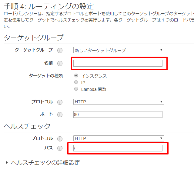 次にルーティングの設定です。ターゲットグループについては、名前にわかりやすい名前を設定します。ヘルスチェックのところの「パス」は、インスタンスの生存チェックに使われるパスですので、自身の状況にあったパスを設定します。ここが正しくないとインスタンスがロードバランサーに登録されないので注意が必要です。
