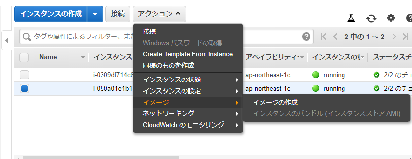 「イメージの作成」ボタンを押すと、処理が開始します。作成されたイメージはEC2のAMIのところで確認できます。