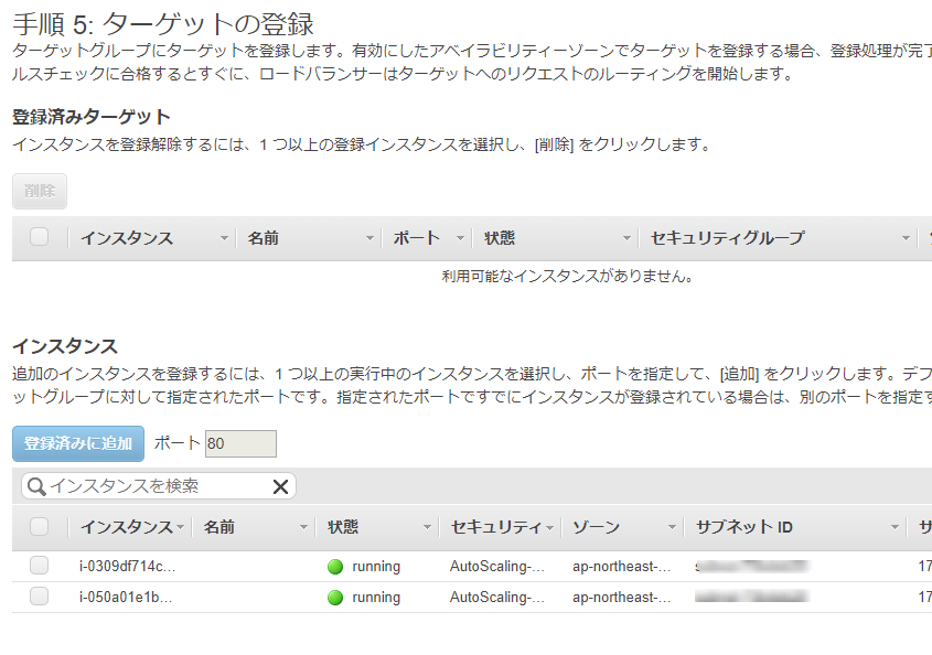 ターゲット(ロードバランサーの配下におくインスタンス)ですが、今回はauto scalingグループで利用するので、デフォルトのままで確認ページに進みます。