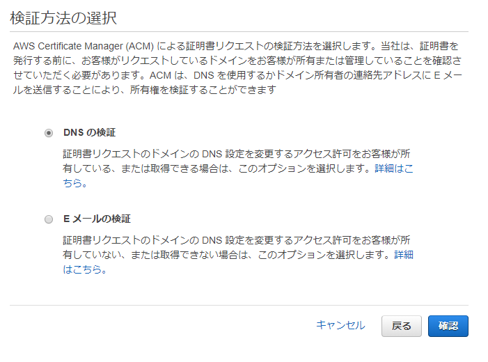 DNSの所有権の確認方法を選びます。「DNSの検証」は、DNSに設定を行うだけで、証明書の自動更新なども行われるのでとても便利ですので、こちらを選びます。