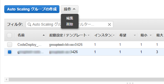 EC2のauto scalingグループにアクセスすると、先程作成したauto scalingグループが出ています。チェックして、「操作」を押し、編集に進みます。