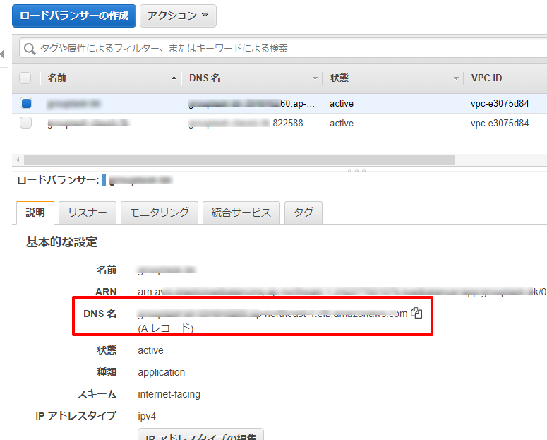 EC2のロードバランサーを選ぶと、作成したロードバランサーの一覧が表示されますので、該当するものにチェックします。チェックすると、下のほうに詳しい設定情報が表示されます。