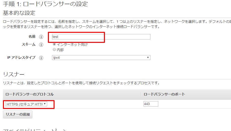 以下の欄にロードバランサーの名前を設定します。わかりやすい名前がよいと思います。ロードバランサーにはhttpsでのみアクセスを許可したいので、リスナーにはHTTPSを選択します。
