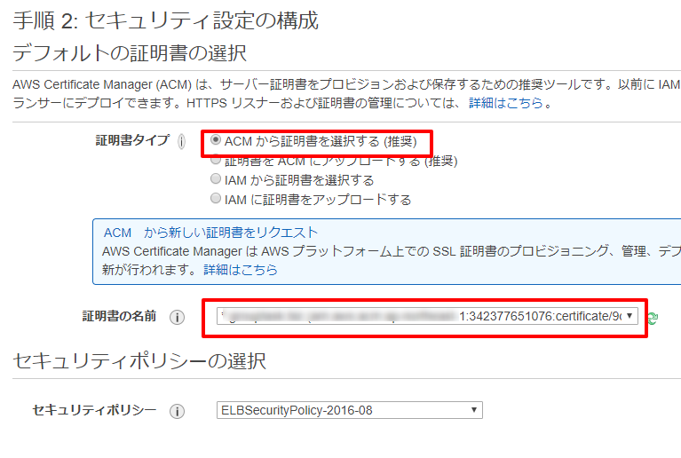 HTTPSでアクセスしたときに利用するssl証明書を設定します。上のほうのcertificate manager(ACM)で作成したものを選択します。