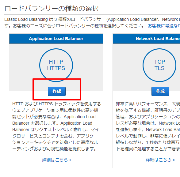 awsのEC2の「ロードバランサー」でロードバランサーを作成します。今回はApplication Load Balancerを作成します。