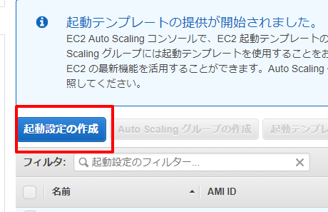 EC2のauto scalingの「起動設定」に進み、起動設定の作成を開始します。