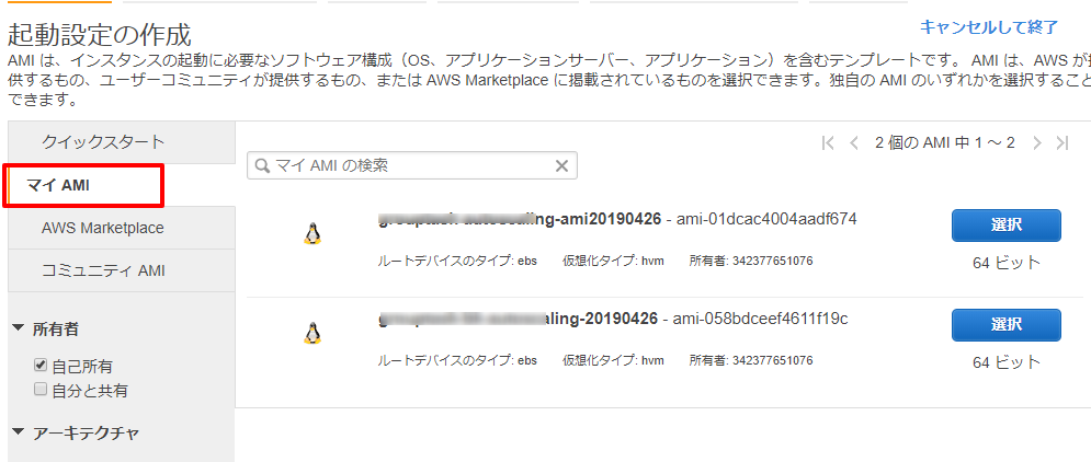 AMIの選択では、「マイAMI」のタブより、先程作成したイメージを選択します。