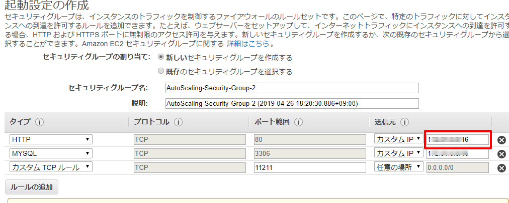 セキュリティグループについては、ロードバランサーとの通信はhttpなのでhttpを許可します。送信元はロードバランサーと同じアドレス範囲を割り当ておきます。確認ボタンを押して次に進むと起動設定の作成が完了します。