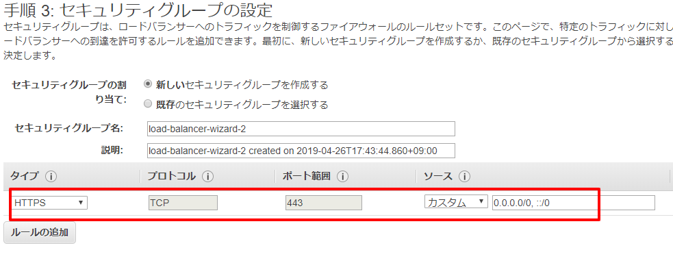次にロードバランサーのセキュリティグループを設定します。既存のものがあるのなら、適したものを利用します。今回は、新規に作成します。許可するのはhttpsだけなので、赤枠のところにhttpsのみ設定します。